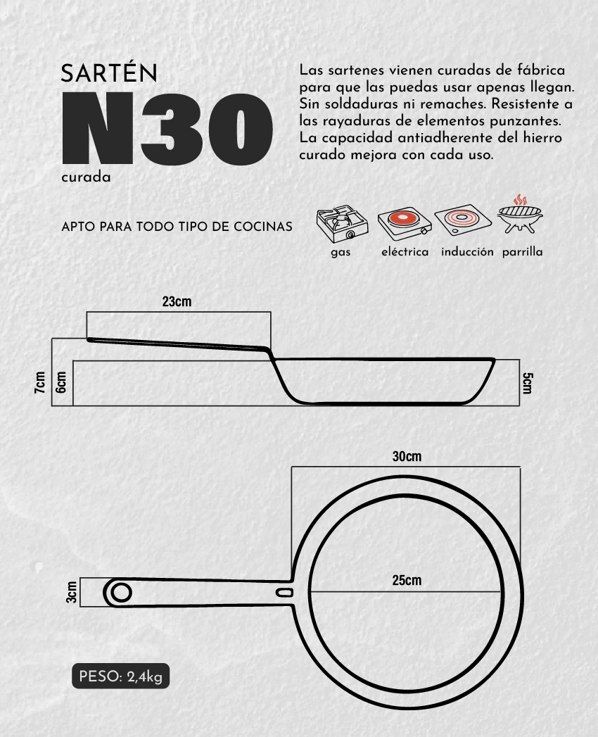 Incluye: 1 (una) Sartén N30 y DE REGALO 1 (una) Bifera N23 curada.