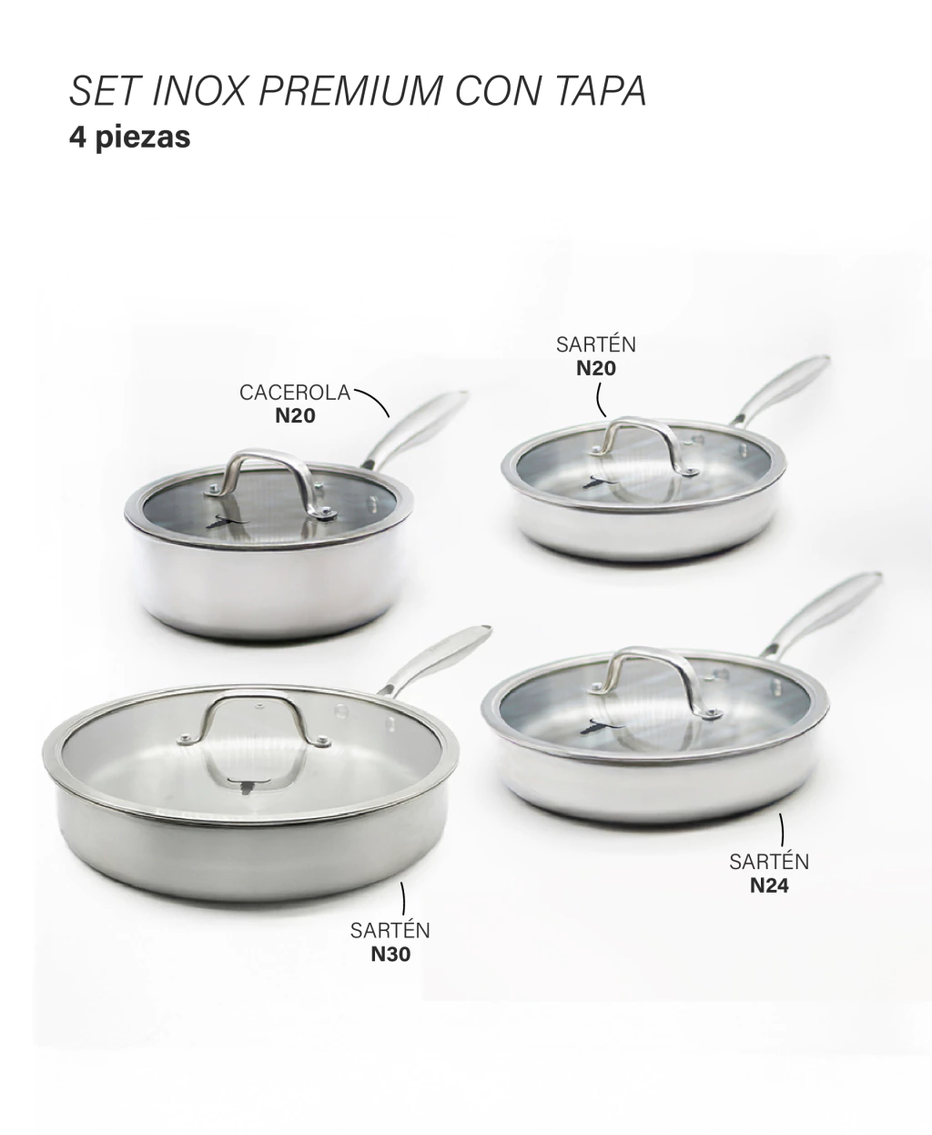 El Set Inox Premium con Tapa reúne cuatro piezas esenciales de cocina para equiparte de manera completa, práctica y profesional, todas fabricadas en acero inoxidable Triply SS304, para una cocción pareja, segura y eficiente. La combinación de sartenes y cacerola te permite cocinar con versatilidad y pasar de una preparación a otra sin límites.